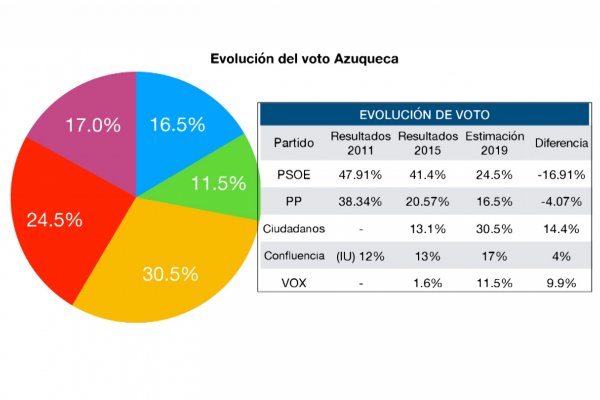 El nuevo pleno azudense podría estar presidido por Ciudadanos, que ganaría con claridad los comicios municipales con un 30,50%, lo que le otorgaría una representación de 7 concejales. La formación naranja crece 17,4 puntos respecto a las elecciones de 2015